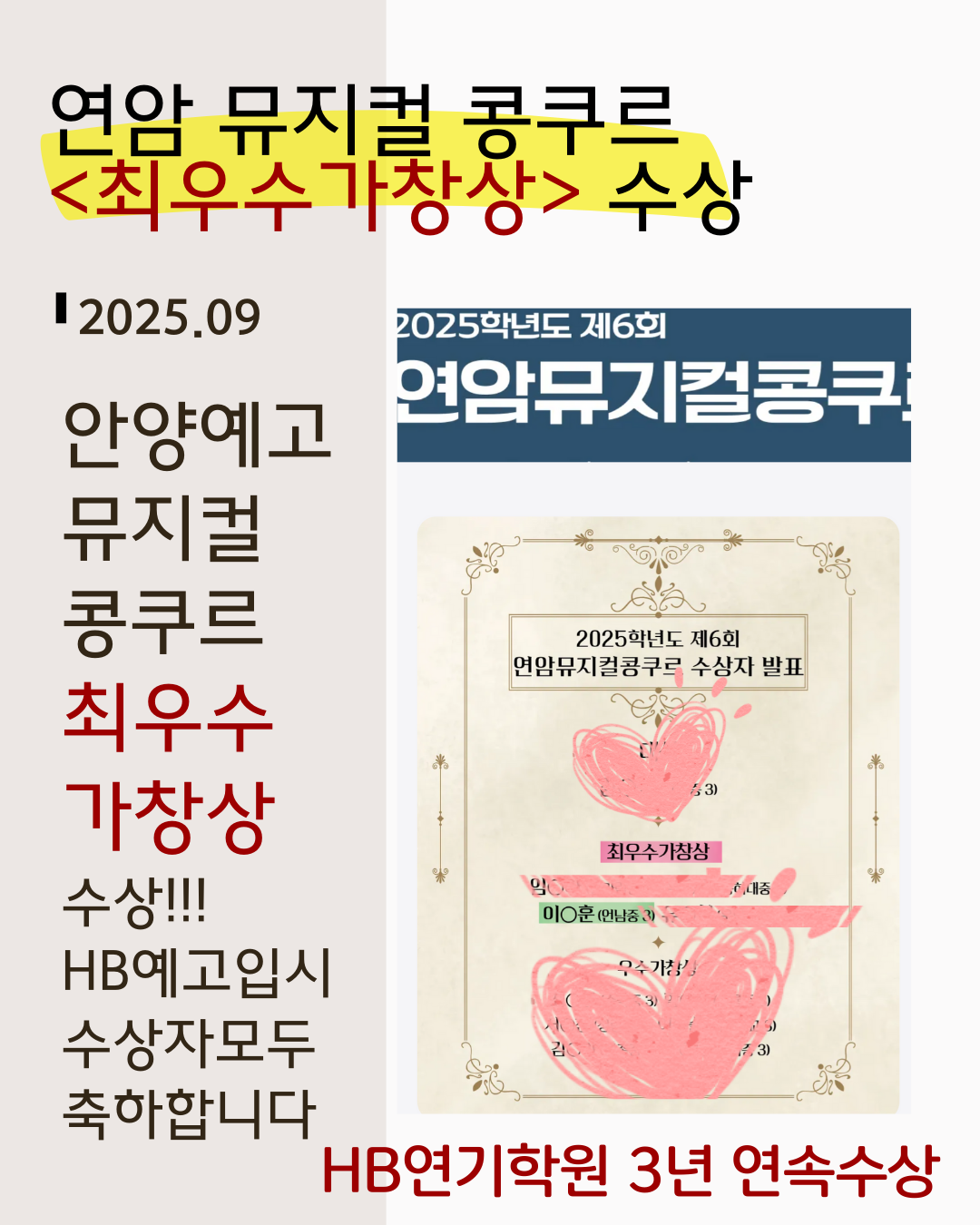 한림예고 <한림연기/뮤지컬 콘테스트>에 이어, 안양예고에서 주최하는 <연암뮤지컬콩쿠르> 수상소식입니다.