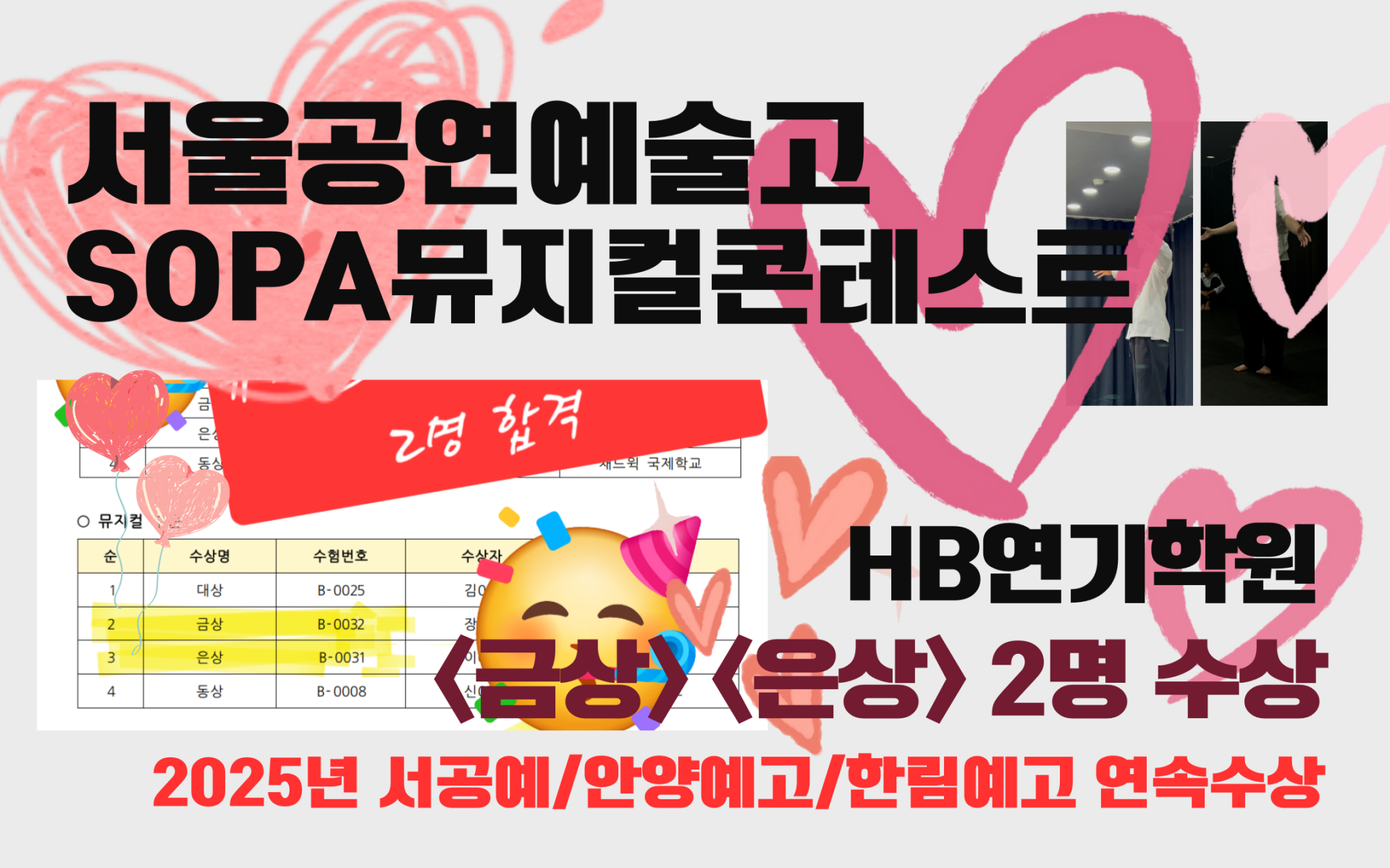 서울공연예술고등학교에서 주최하는 2025년 <SOPA 뮤지컬콘테스트>에서 우리학원 수강생이 <금상> <은상>을 모두 수상하였습다.